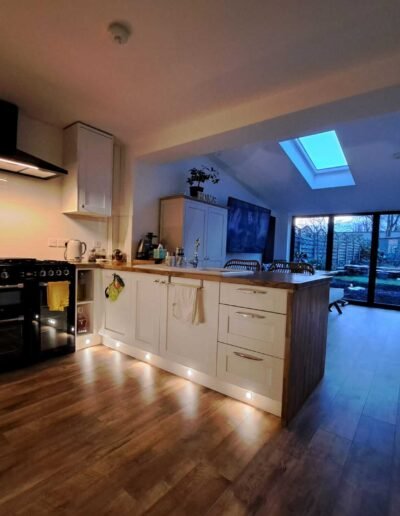 This project delivered a stunning transformation, converting a traditional space into an expansive, light-filled open-plan kitchen and dining area. The design skillfully blends classic cabinetry with warm, natural materials to create a highly functional and inviting heart of the home.