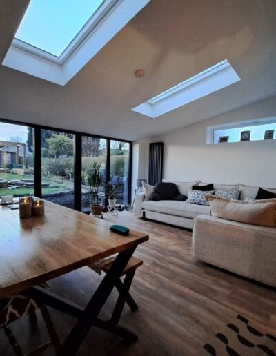 Crucially, the space achieves exceptional natural light through the vaulted ceiling extension featuring large roof windows/skylights and floor-to-ceiling sliding glass doors. This seamless visual connection to the outdoor garden area maximizes the feeling of space and provides an ideal environment for both daily life and entertaining.