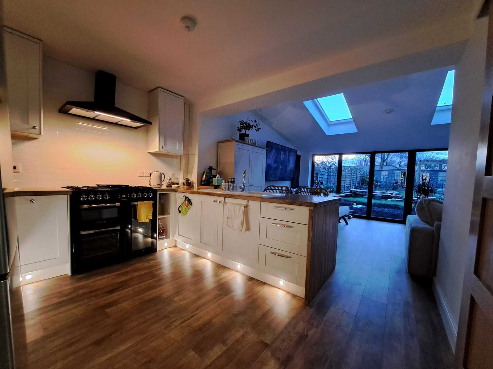 The bespoke island unit serves as the central feature, defined by its contrasting butcher block countertop and integrated base lighting, which adds a warm glow to the wood-effect flooring. High-end integrated appliances, including a classic range cooker with an overhead chimney extractor, are framed by crisp, white shaker-style cabinetry, maintaining a clean, timeless aesthetic.