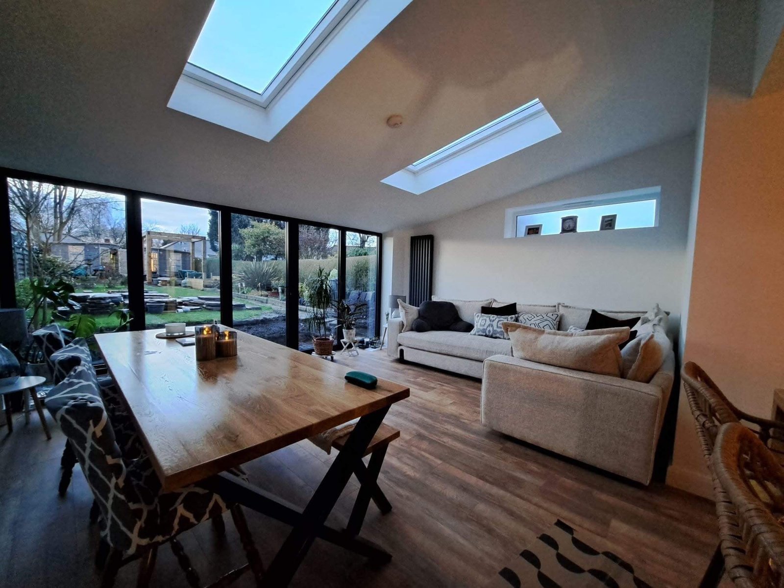 Crucially, the space achieves exceptional natural light through the vaulted ceiling extension featuring large roof windows/skylights and floor-to-ceiling sliding glass doors. This seamless visual connection to the outdoor garden area maximizes the feeling of space and provides an ideal environment for both daily life and entertaining.