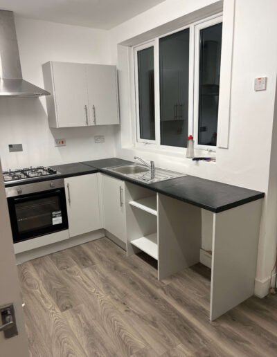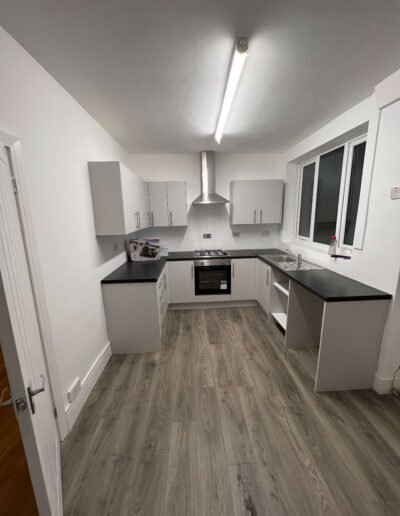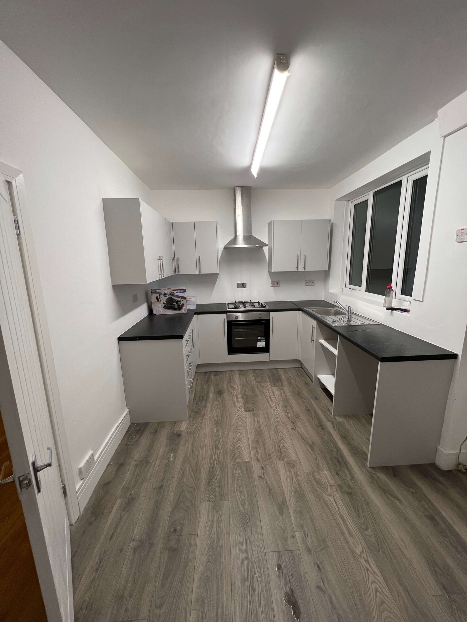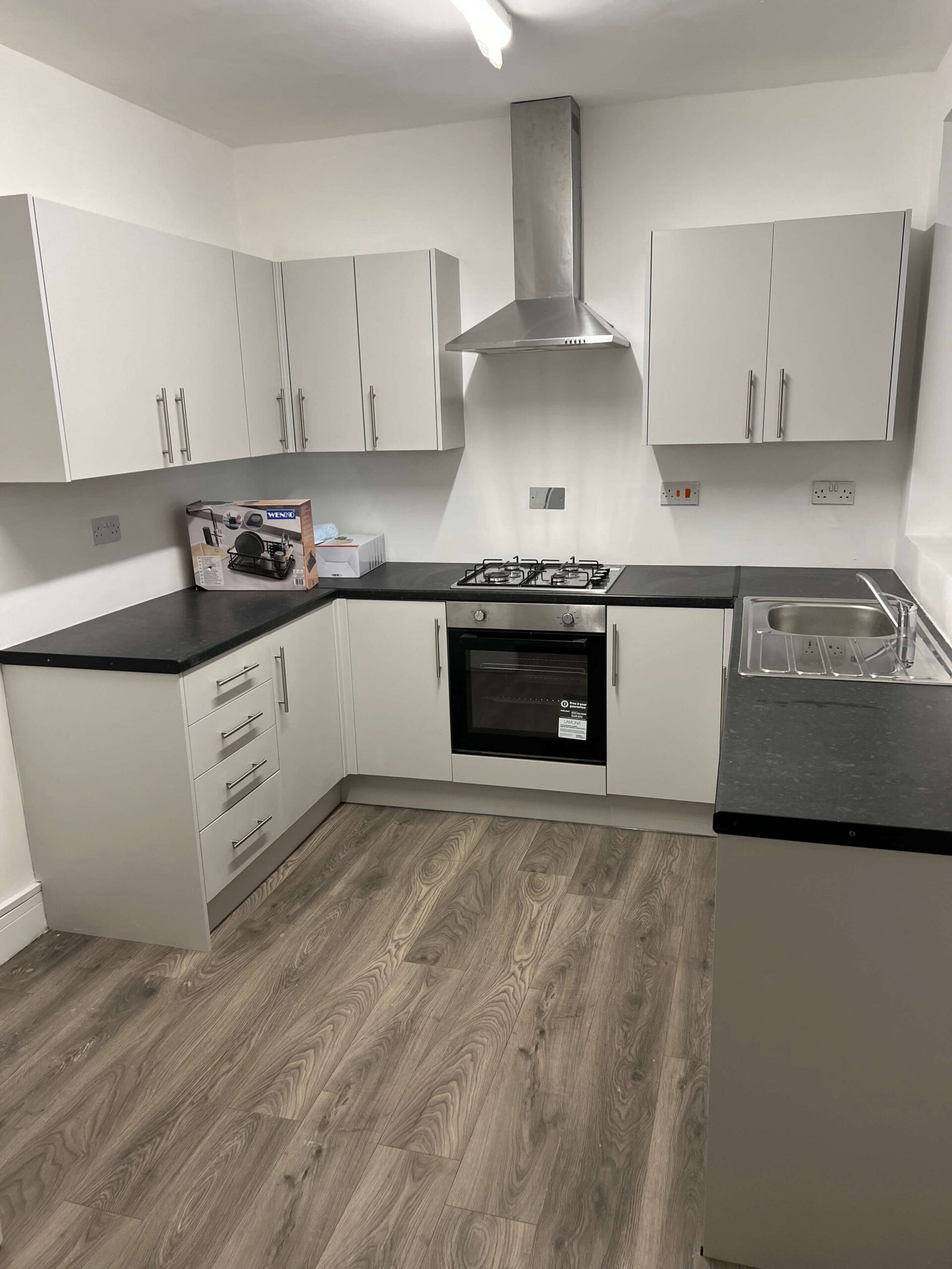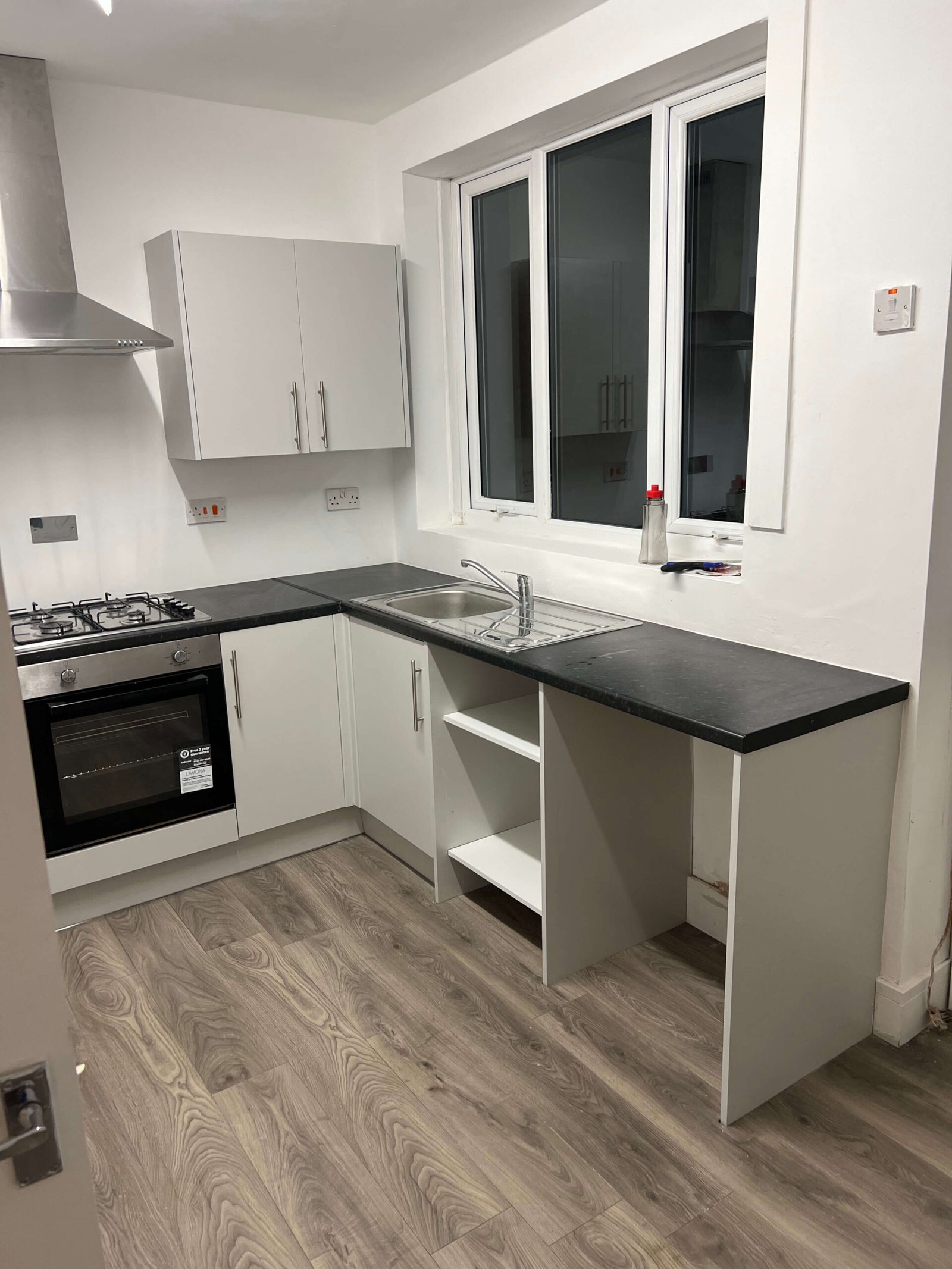 Key features include a four-burner gas hob with an integrated oven beneath, topped by a sleek stainless steel chimney extractor hood. The kitchen also boasts a stainless steel single-bowl sink with drainer situated beneath a large window for natural light. The design is finished with a durable, wood-effect grey laminate flooring and white painted walls, creating a crisp, versatile, and easy-to-clean environment. The layout efficiently utilizes the room's footprint, including open shelving next to the sink area for potential appliance or storage placement.