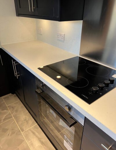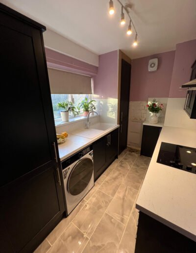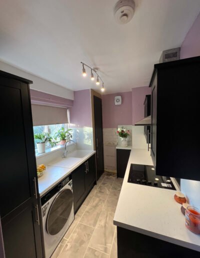 This contemporary kitchen has been carefully redesigned to maximise both space and functionality while delivering a clean, modern aesthetic. Deep charcoal cabinetry creates a strong, elegant framework, balanced beautifully by the crisp white worktops and matching full-height splashbacks, which reflect light and keep the space feeling open. The streamlined layout ensures everything is within easy reach, making the kitchen highly practical for everyday use without feeling cramped.