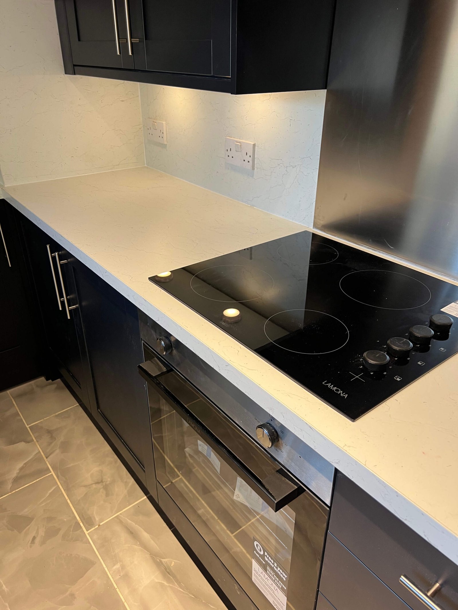 Thoughtful details elevate the design throughout, from the integrated appliances and sleek hob to the stainless steel splashback and extractor that add a subtle industrial edge. Soft under-cabinet lighting enhances the work surfaces, while ceiling spotlights provide warm, even illumination across the room. The marble-effect floor tiles tie the whole scheme together, adding texture and visual interest. The result is a stylish, efficient kitchen that feels modern, cohesive, and perfectly suited to contemporary living.