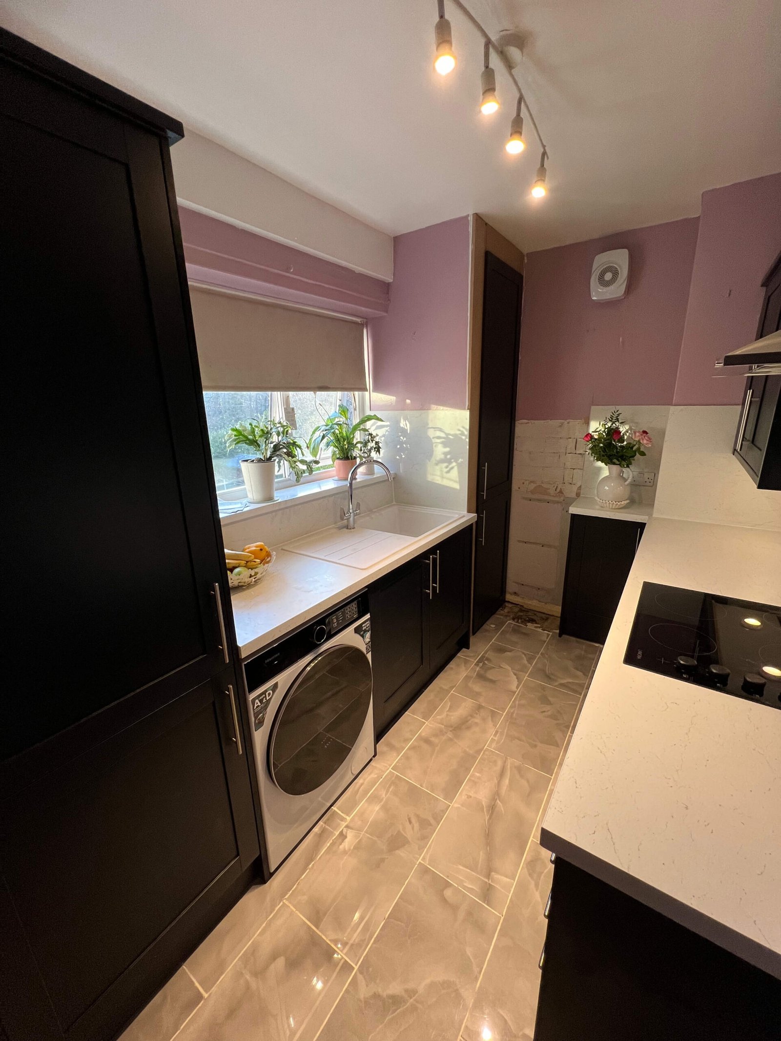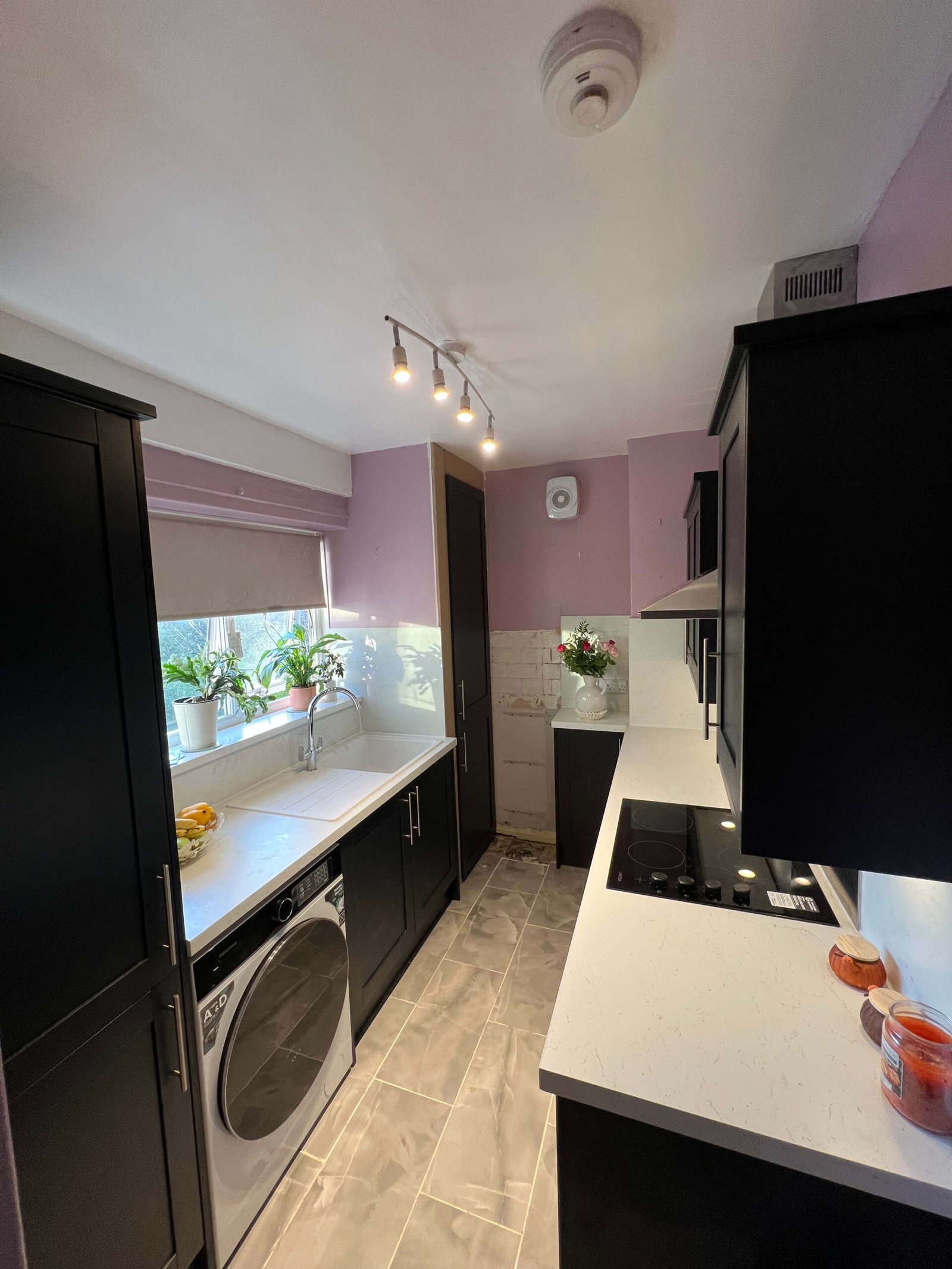 This contemporary kitchen has been carefully redesigned to maximise both space and functionality while delivering a clean, modern aesthetic. Deep charcoal cabinetry creates a strong, elegant framework, balanced beautifully by the crisp white worktops and matching full-height splashbacks, which reflect light and keep the space feeling open. The streamlined layout ensures everything is within easy reach, making the kitchen highly practical for everyday use without feeling cramped.